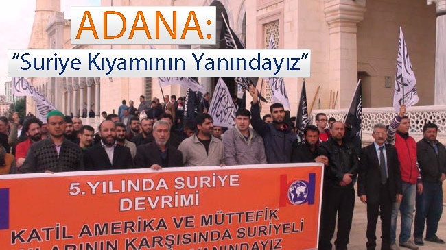 On the 5th anniversary of the Syrian Uprising, Hizb ut Tahrir / Wilayah Turkey and its supporters held a picket in the city of Adhana after Jummah prayer 22 Jumada I 1436 AH - 13 March 2015 CE at the Adana Merkez Sabancı Mosque, against the crusader coalition and in support of the sincere people of Ash-Sham Revolution titled, "We stand with the ash-Sham Revolution".